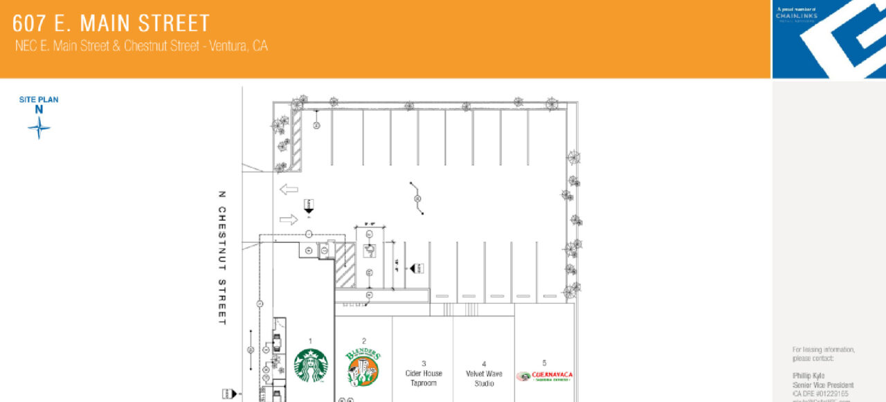 607 E. Main Street is a high visibility ±4,370 square foot multi-tenant retail pad at the northeast corner of E. Main Street and Chestnut Street in Downtown Ventura, California.