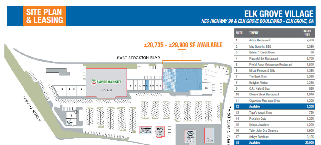 Excellent Jr. Anchor opportunity at Elk Grove Village, which is located on the north east corner of Elk Grove Boulevard & Emerald Vista Drive alongside direct access to the onramp to Highway 99. The ±106,698 SF center boasts high traffic counts due to its proximity to the highway and strong demographics, with an average household income of $150,472 within a 1-mile radius. Elk Grove remains one of the strongest residential growth submarkets in the Greater Sacramento Region, making the community an ideal location for businesses large and small looking to be close to a skilled and diverse workforce.