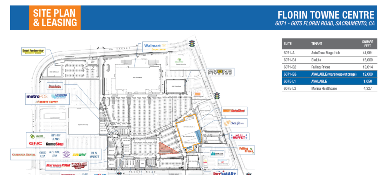 Situated on Florin Road, the main east-west traffic artery in the South Sacramento sub-trade area, Florin Towne Centre is part of over two million square feet of retail space within a 1-mile radius. Notable retail anchors include Walmart Supercenter, AutoZone Mega Hub, Chuze Fitness, Smart Foodservice Warehouse Stores and Petsmart. The center also benefits from high traffic tenants such as Turner’s Outdoorsman, Starbucks, Verizon Wireless, Eyeglass World, Gamestop and GNC.