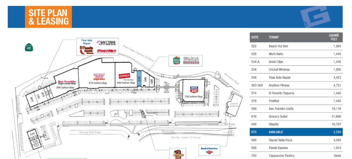 Part of 1.9 million square feet of commercial retail space within a seven mile radius of the center, this ±112,472 square foot neighborhood center has strong anchor co-tenants including Grocery Outlet, Staples and Ben Franklin Crafts. The center features easy access, ample parking and is centrally located to serve residents in both the Grass Valley/Nevada City markets.