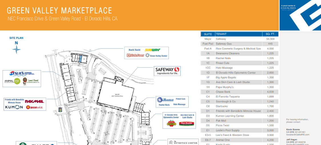 This Safeway-anchored neighborhood center is located on the northeast corner of Green Valley Road and Francisco Drive in El Dorado Hills, California, one of El Dorado County’s most upscale trade areas.