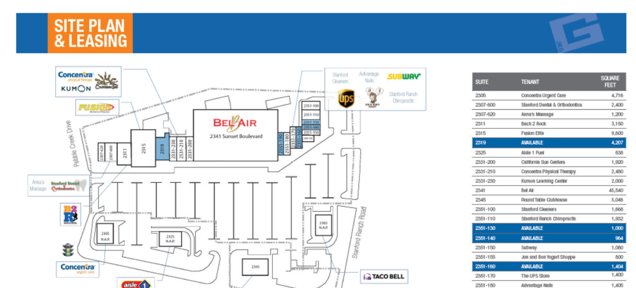 The center offers a second generation salon space that is situated at the main ingress/egress point along Stanford Ranch Road.